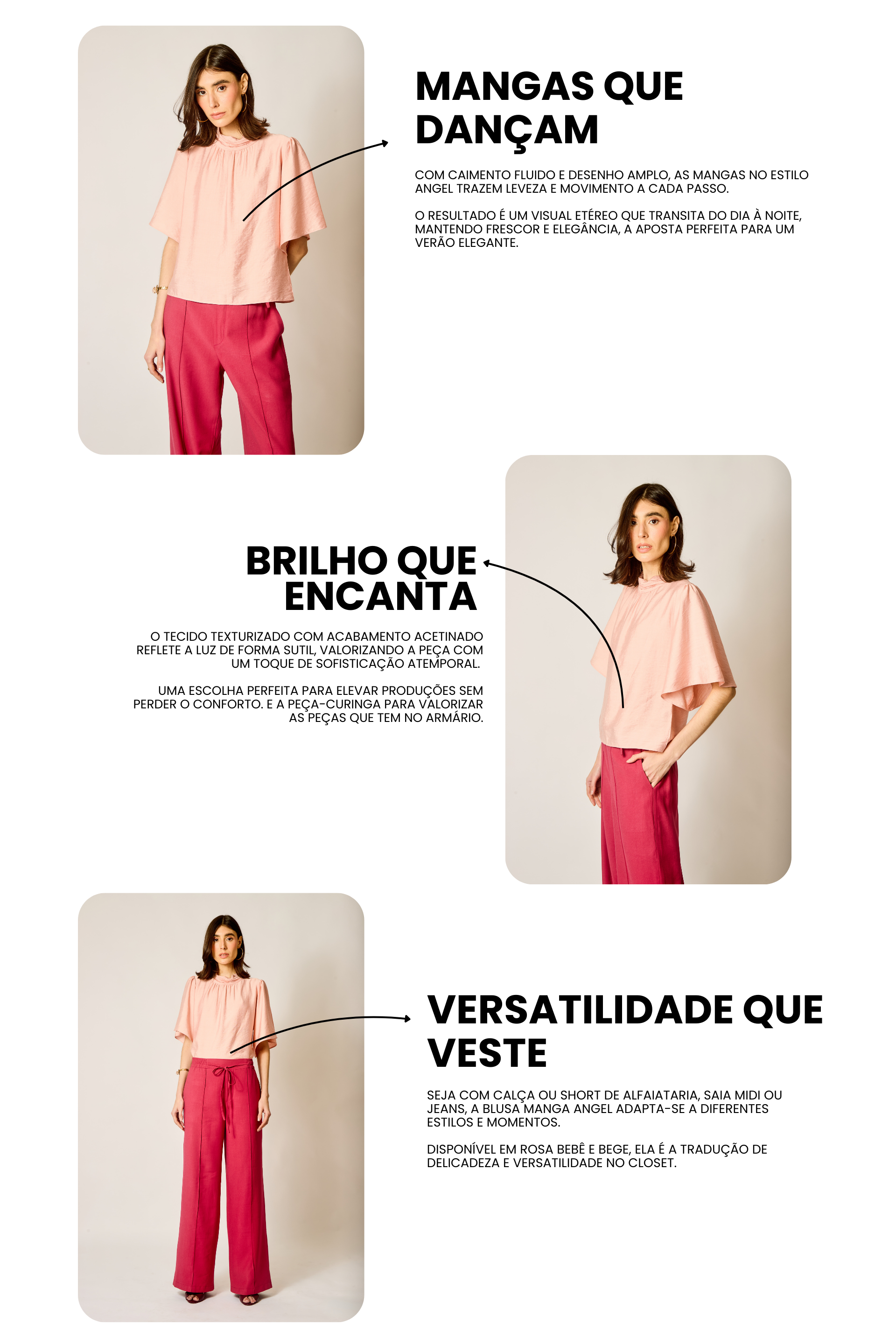 A Blusa Fluida Manga Angel tem design elegante, trazendo gola dupla com pregas delicadas, decote levemente franzido e mangas amplas no estilo angel, que conferem leveza e feminilidade. A barra lenço reforça o acabamento refinado, enquanto as costas contam com abertura sutil e fechamento por três botões forrados, garantindo charme e funcionalidade.