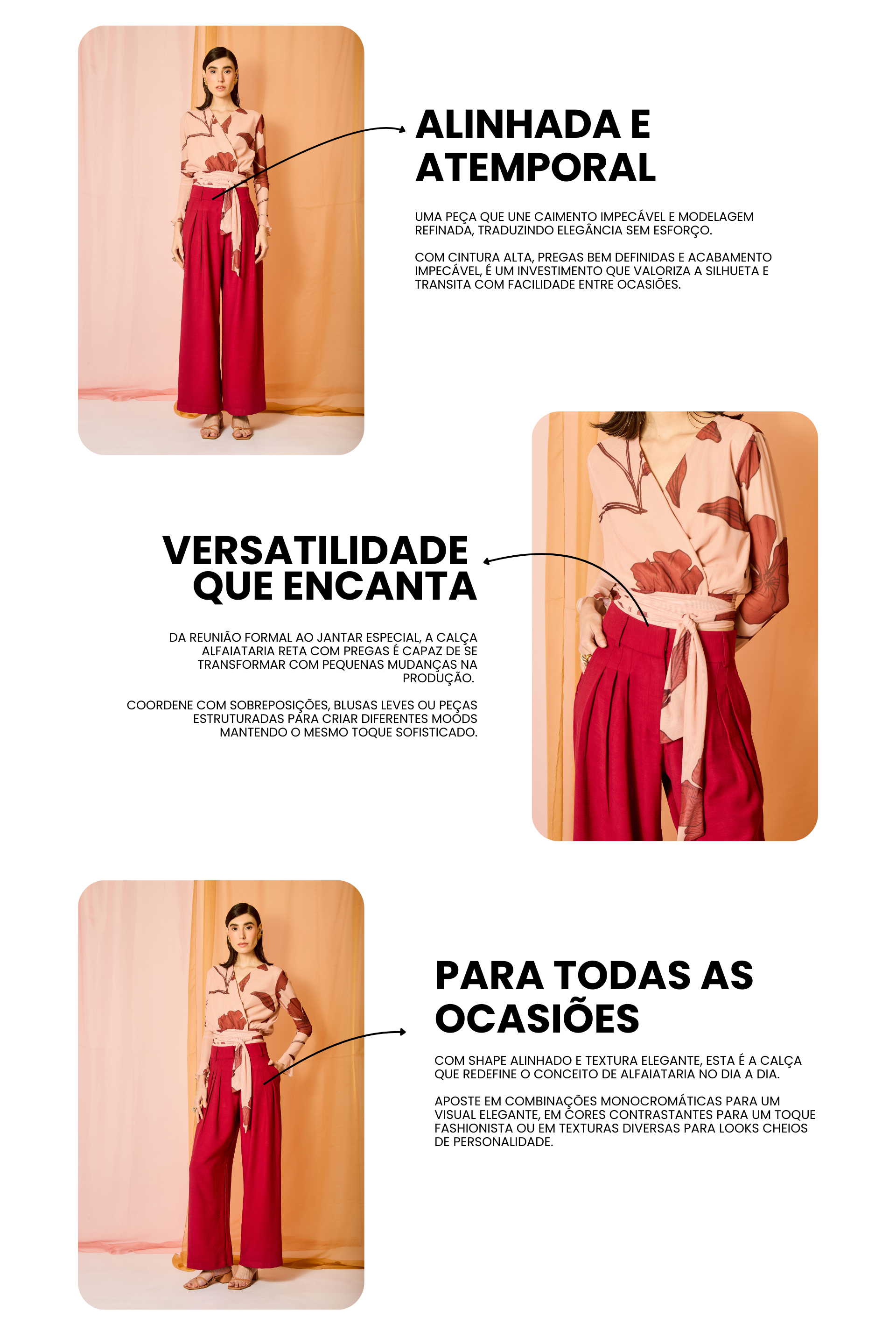 Confeccionada em tecido plano com 90% viscose e 10% poliéster, apresenta textura suave ao toque, caimento fluido e excelente estrutura. O tecido valoriza o shape, não marca e mantém um visual sofisticado. A viscose proporciona conforto e frescor, enquanto o toque acetinado garante aparência polida, perfeita para composições elegantes.