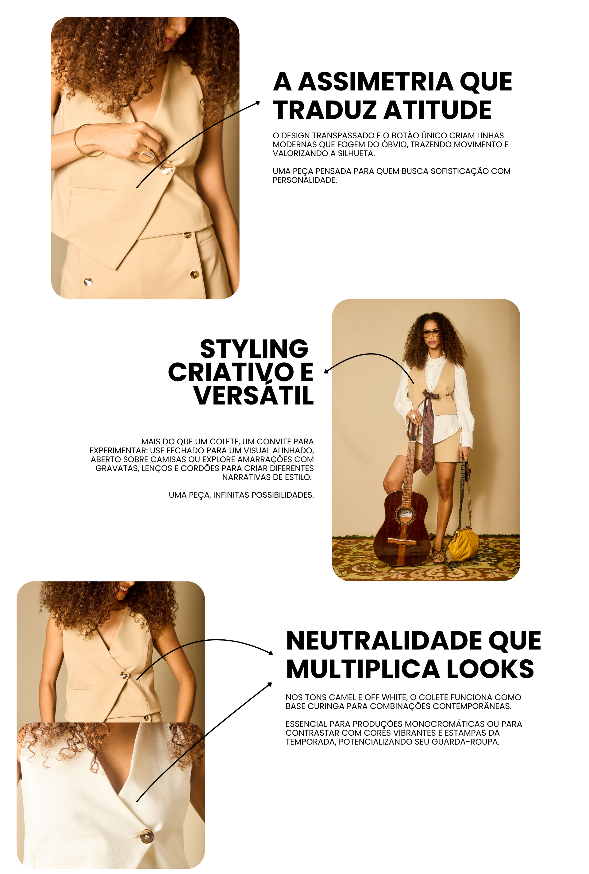 O Colete Alfaiataria Assimétrico é um convite à expressão pessoal. Com design moderno e proporções equilibradas, ele valoriza a silhueta com um caimento impecável. A modelagem curta e transpassada traz fechamento por botão único e recortes estratégicos, criando uma peça sofisticada e atemporal que transita entre diferentes estilos.