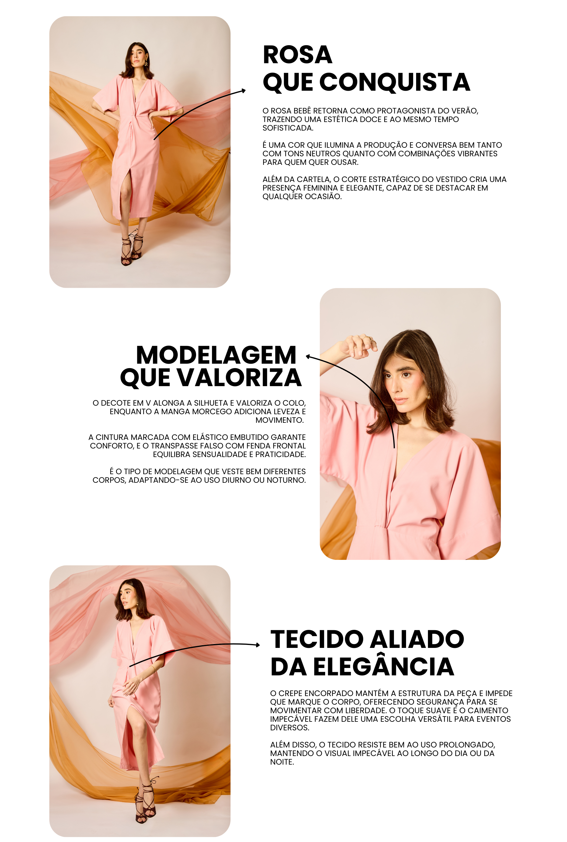 Confeccionado em crepe 100% poliéster, é encorpado e não marca o corpo, proporcionando segurança e elegância ao vestir. A cor rosa bebê, tendência confirmada para o verão, traz frescor e delicadeza, criando um visual leve, mas com presença marcante.